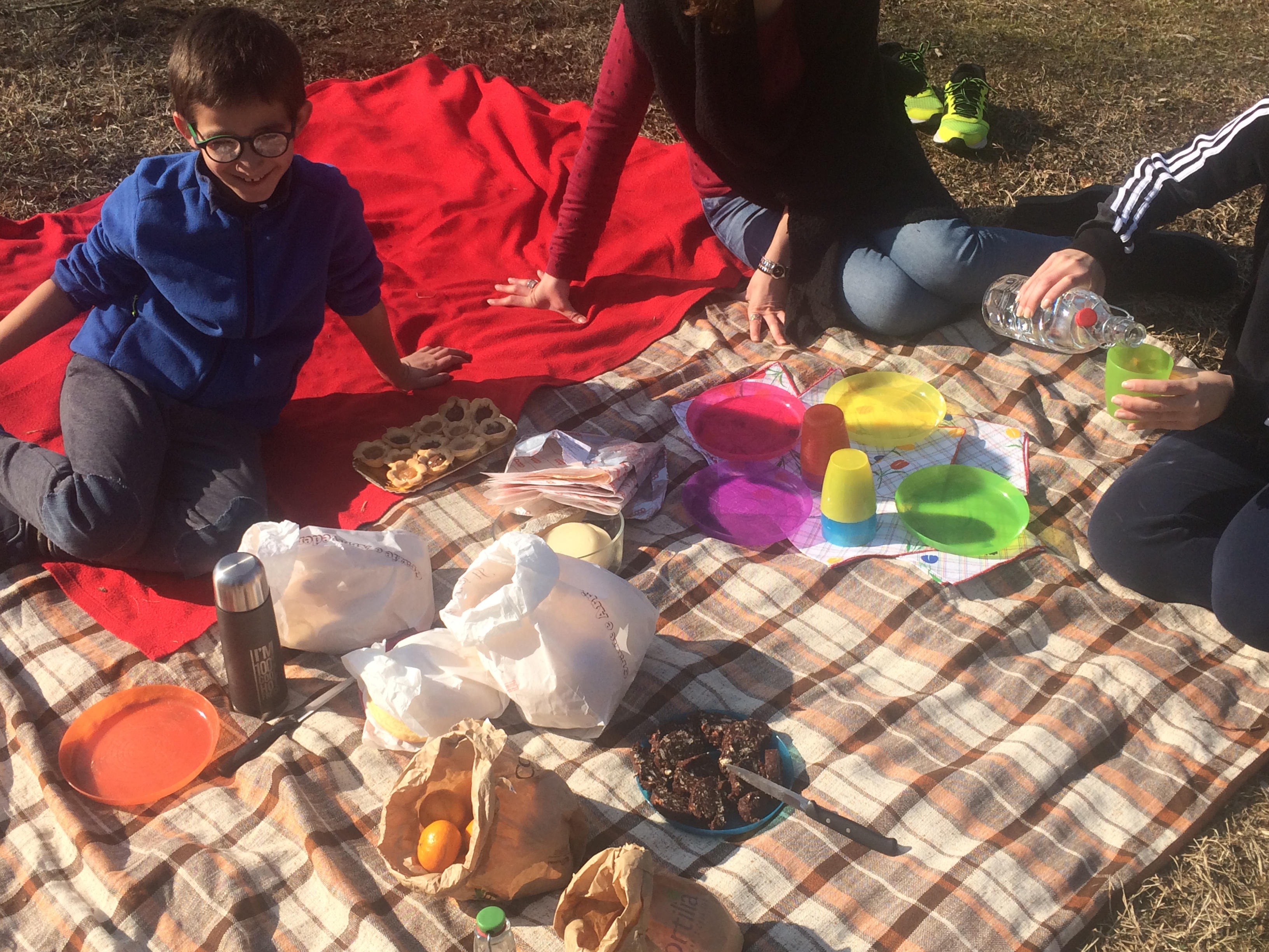 affettato e formaggio del banco gastronomico col minimo dell’imballaggio, torta fatta in casa, piatti – tovaglioli – bicchieri – coltelli lavabili, pane del panettiere nel sacchetto di carta, frutta in sacchetti di carta riciclata e acqua e the caldo in bottiglie di vetro e thermos…